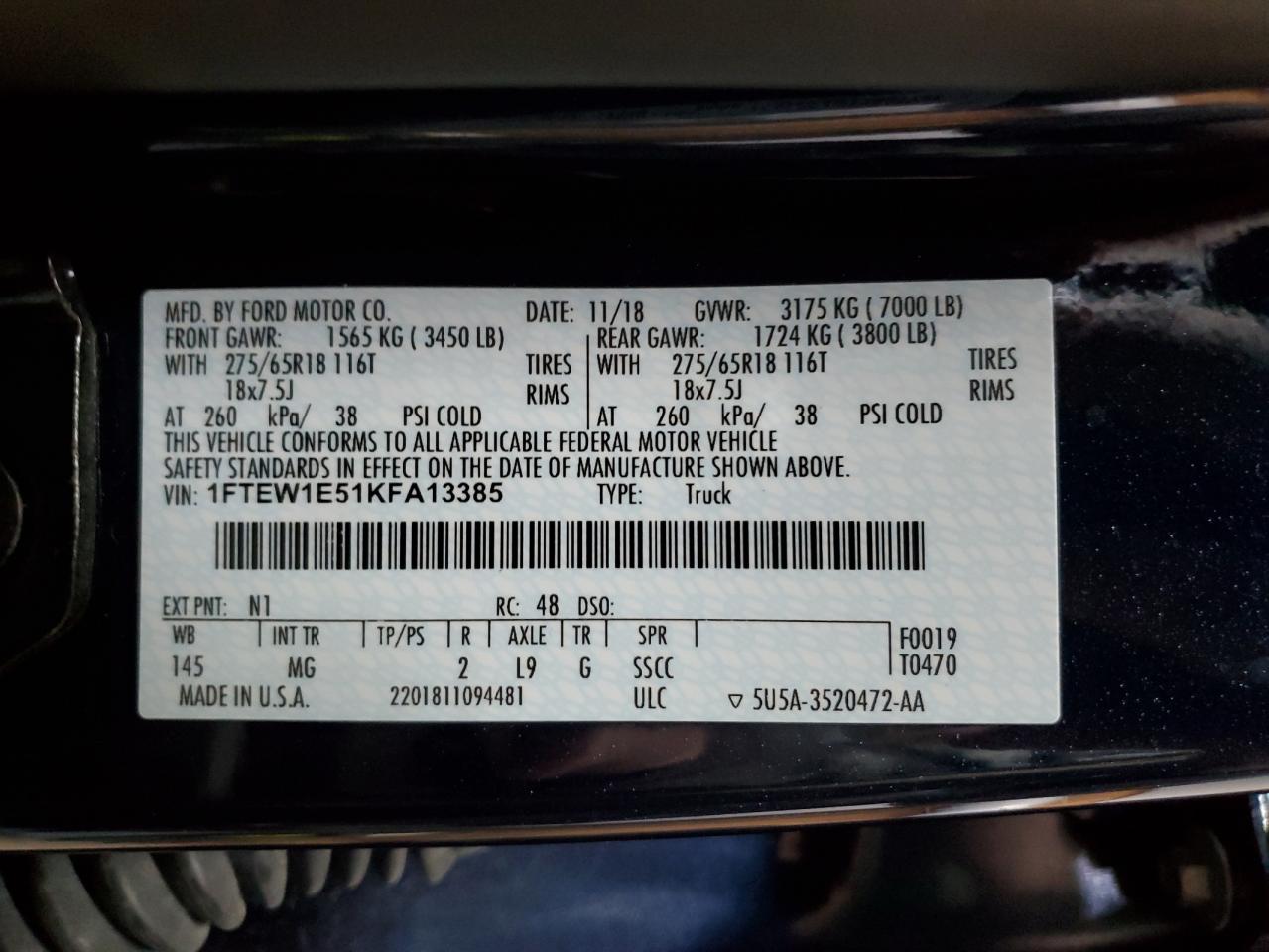 Машина оснащена 8 циліндровим двигуном, об’ємом 5.0 літра. Коробка передач - автомат. Тип палива даної моделі - бензин. Згідно з фотозвітом з аукціону Copart пробіг складає 173 169 км. Номер кузова VIN - 1FTEW1E51KF******.