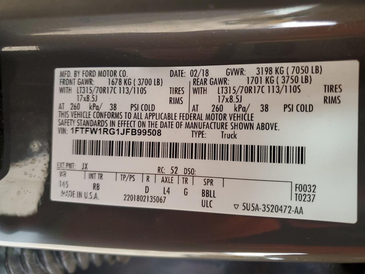 Машина оснащена 6 циліндровим двигуном, об’ємом 3.5 літра. Коробка передач - автомат. Тип палива даної моделі - бензин. Згідно з фотозвітом з аукціону Copart пробіг складає 169 565 км. Номер кузова VIN - 1FTFW1RG1JF******.