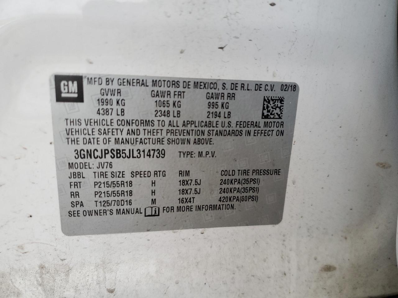 2018 CHEVROLET TRAX 1LT 3GNCJPSB5JL******