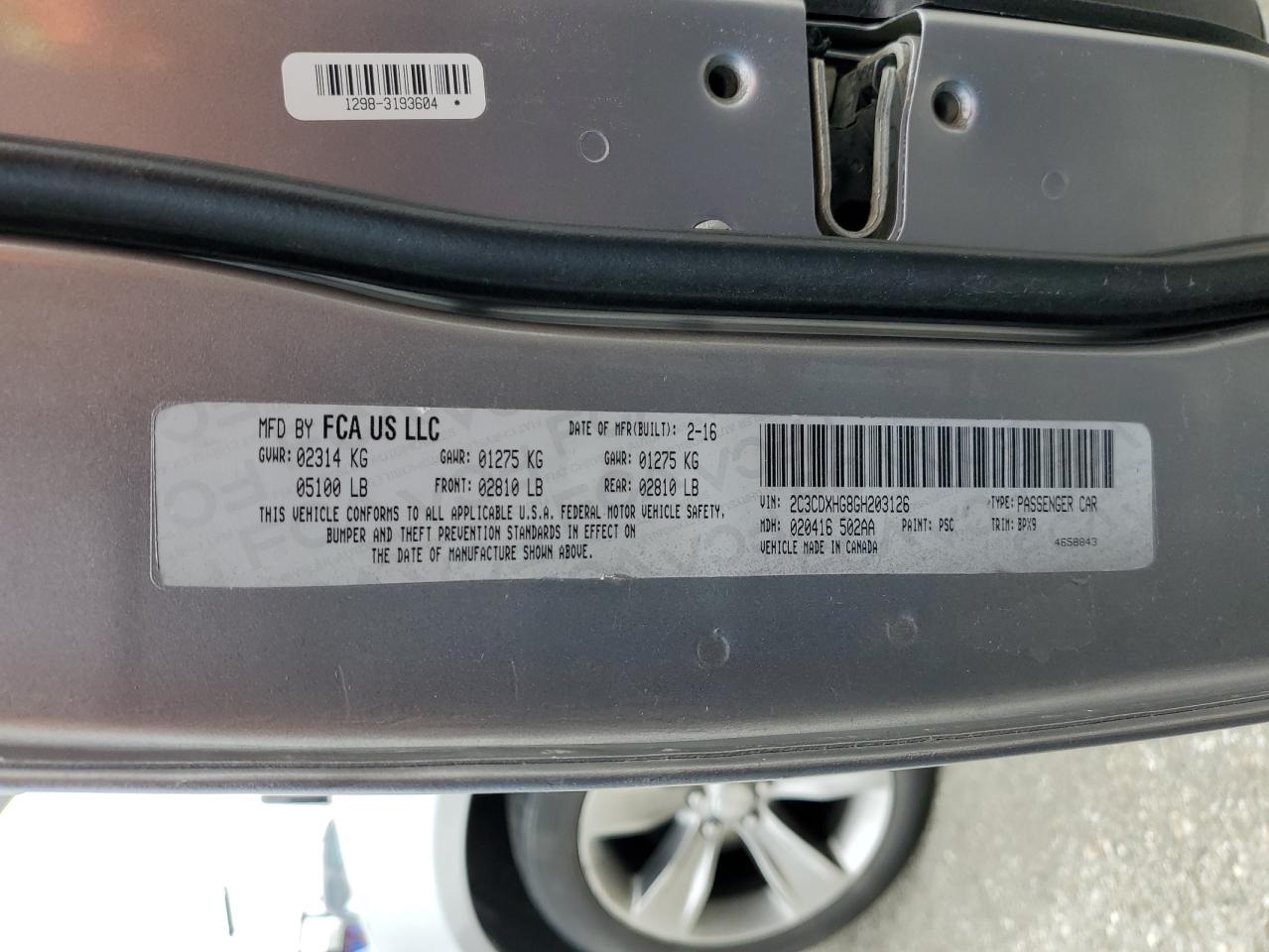 Машина оснащена 6 цилиндровым двигателем объемом 3.6 литров. Данный седан имеет задний привод. Коробка передач - автомат. Тип топлива данной модели – газ-бензин. Согласно фотоотчету с аукциона Copart пробег составляет 241 258 км. Номер кузова VIN - 2C3CDXHG8GH******.