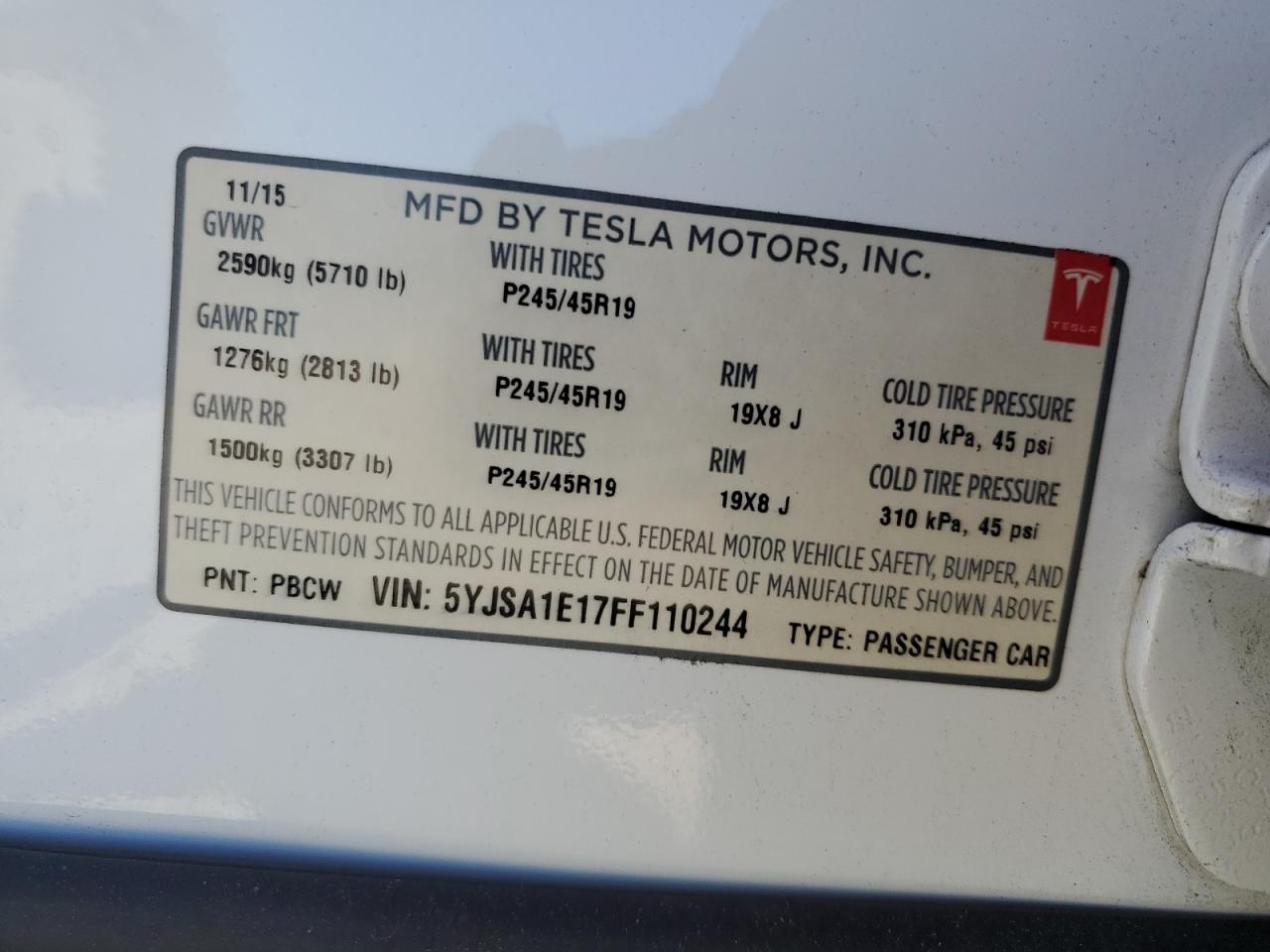 2015 TESLA MODEL S 5YJSA1E17FF******