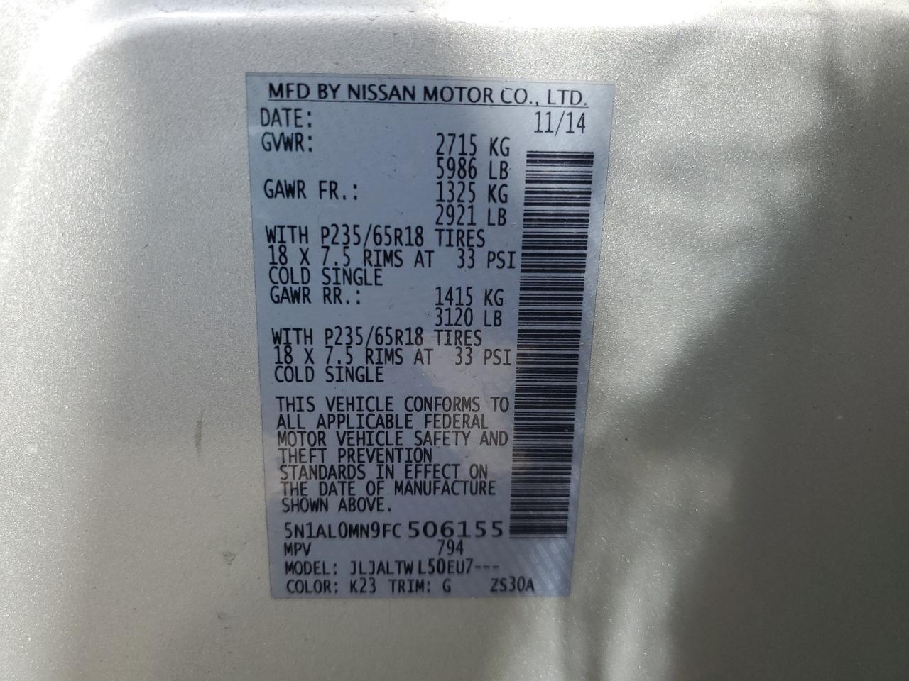 Машина оснащена 6 цилиндровым двигателем объемом 3.5 литров. Данный паркетник имеет передний привод. Коробка передач - автомат. Тип топлива данной модели – бензин. Согласно фотоотчету с аукциона Copart пробег составляет 264 917 км. Номер кузова VIN - 5N1AL0MN9FC******.