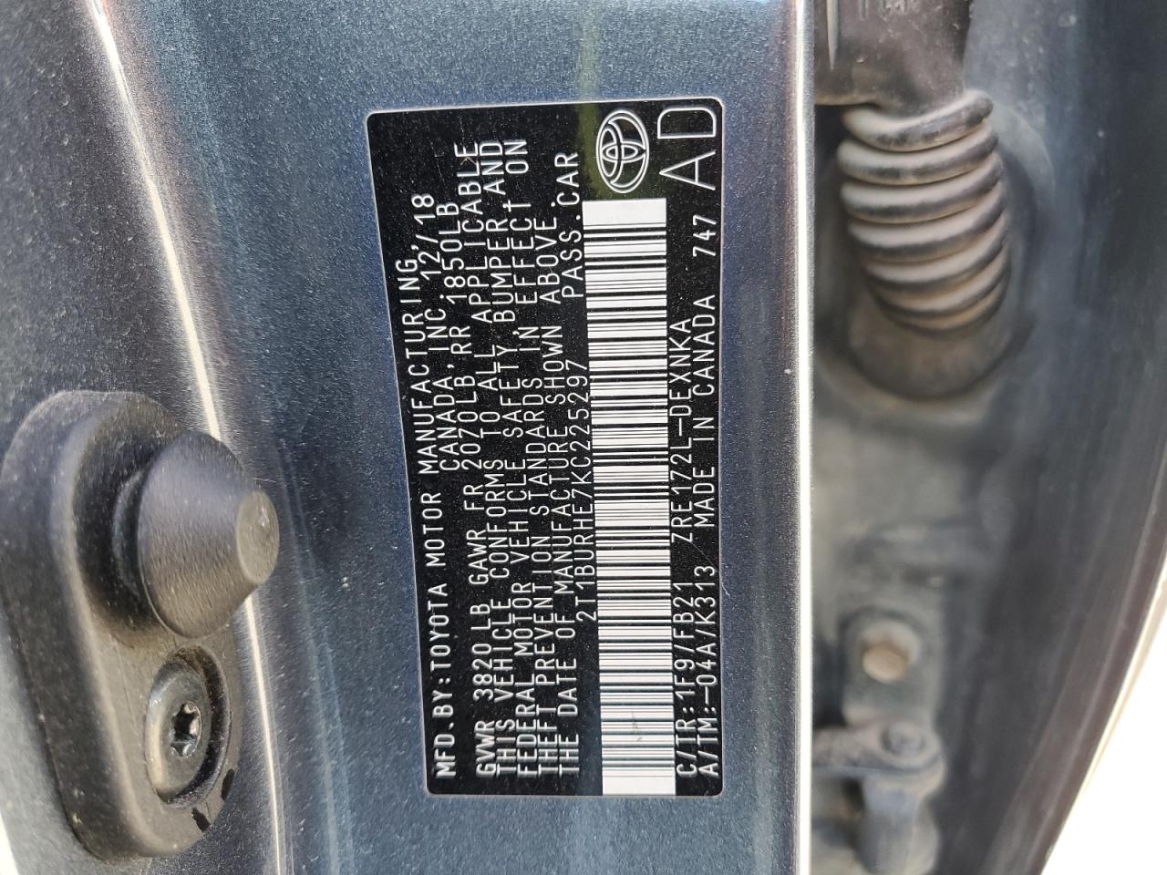 Машина оснащена 4 цилиндровым двигателем объемом 1.8 литров. Коробка передач - автомат. Тип топлива данной модели – бензин. Согласно фотоотчету с аукциона Copart пробег составляет 194 058 км. Номер кузова VIN - 2T1BURHE7KC******.