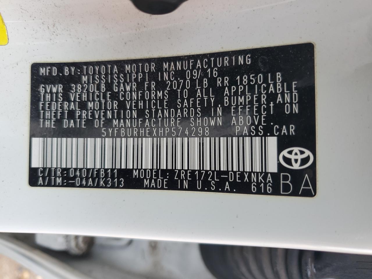 2017 TOYOTA COROLLA L 5YFBURHEXHP******
