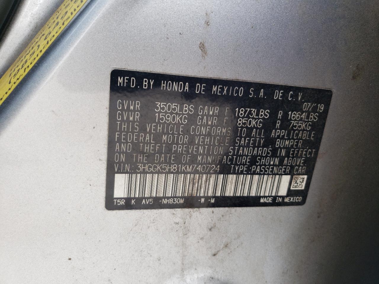 Машина оснащена 4 цилиндровым двигателем объемом 1.5 литров. Коробка передач - автомат. Тип топлива данной модели – бензин. Согласно фотоотчету с аукциона Copart пробег составляет 199 829 км. Номер кузова VIN - 3HGGK5H81KM******.