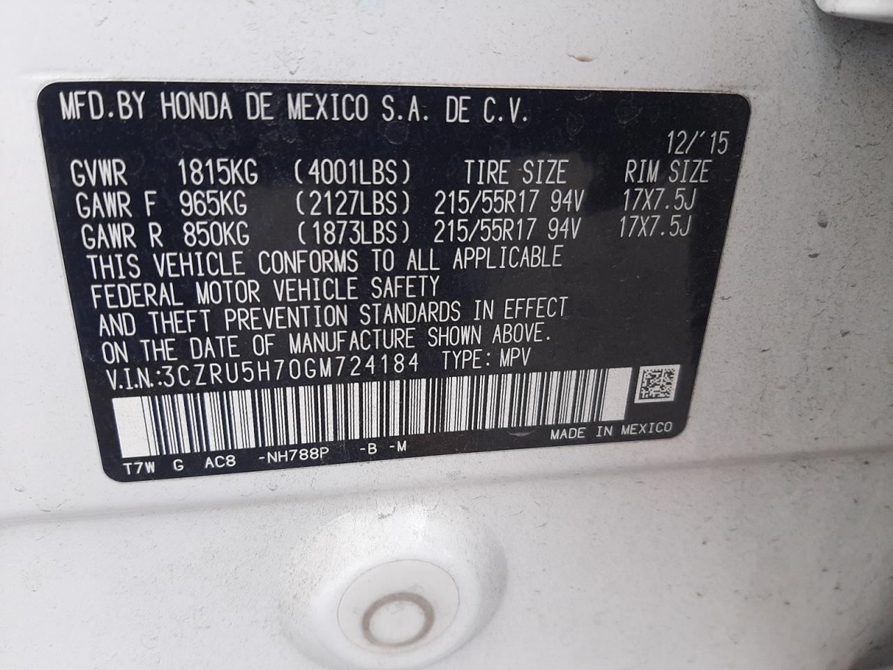 2016 HONDA HR-V EXL 3CZRU5H70GM******
