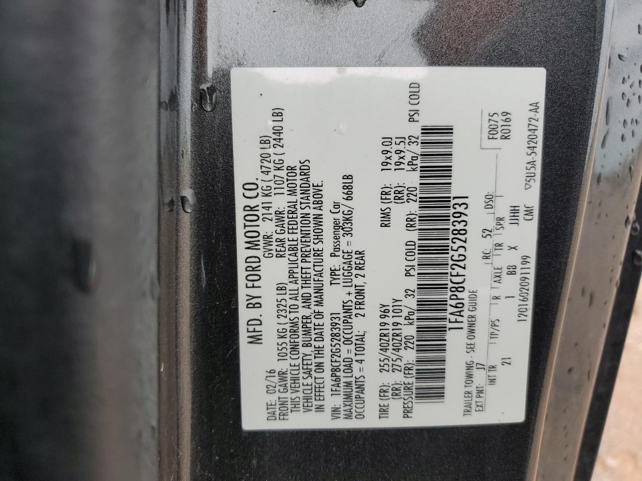 Машина оснащена 8 цилиндровым двигателем объемом 5.0 литров. Тип топлива данной модели – бензин. Согласно фотоотчету с аукциона Copart пробег составляет 179 167 км. Номер кузова VIN - 1FA6P8CF2G5******.
