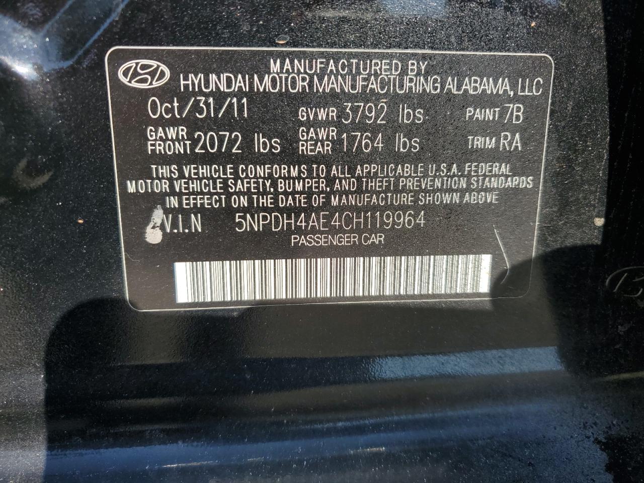 2012 HYUNDAI ELANTRA GLS 5NPDH4AE4CH******