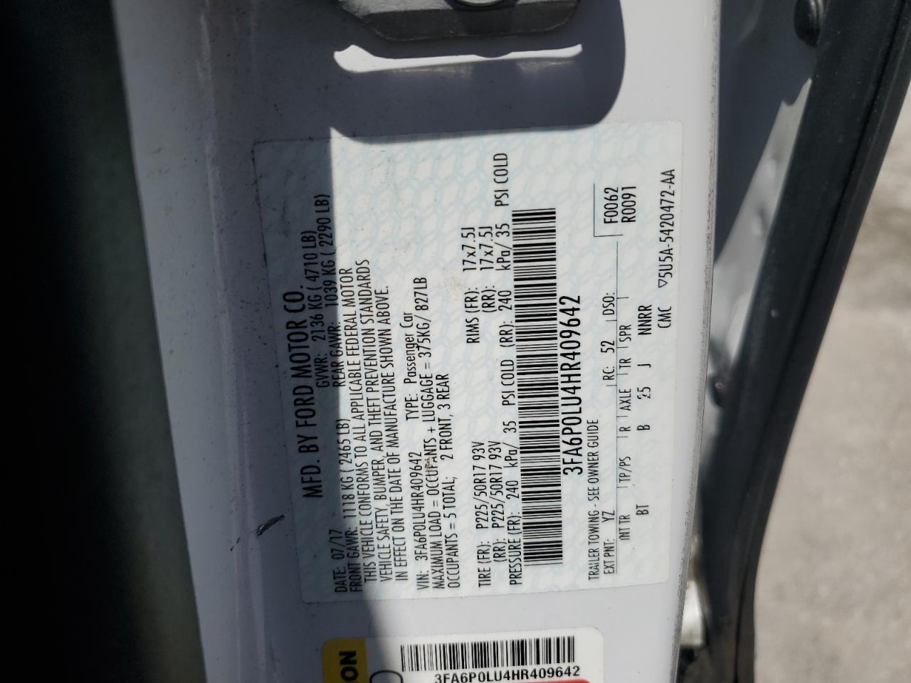 Машина оснащена 4 цилиндровым двигателем объемом 2.0 литров. Данный седан имеет передний привод. Коробка передач - автомат. Тип топлива данной модели – гибрид. Согласно фотоотчету с аукциона Copart пробег составляет 241 492 км. Номер кузова VIN - 3FA6P0LU4HR******.