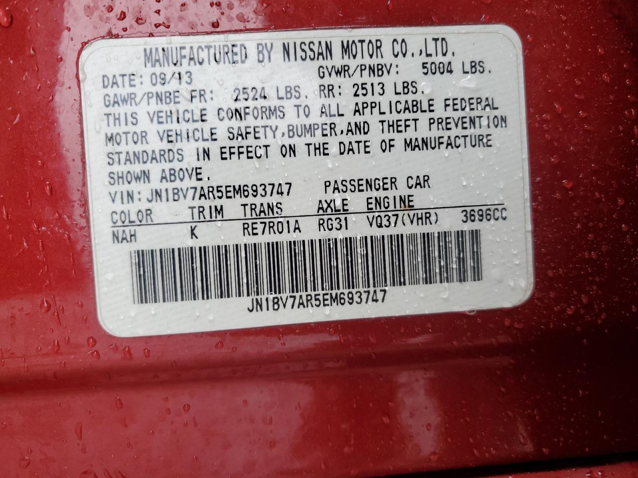 Машина оснащена 6 цилиндровым двигателем объемом 3.7 литров. Коробка передач - автомат. Тип топлива данной модели – бензин. Согласно фотоотчету с аукциона Copart пробег составляет 268 381 км. Номер кузова VIN - JN1BV7AR5EM******.