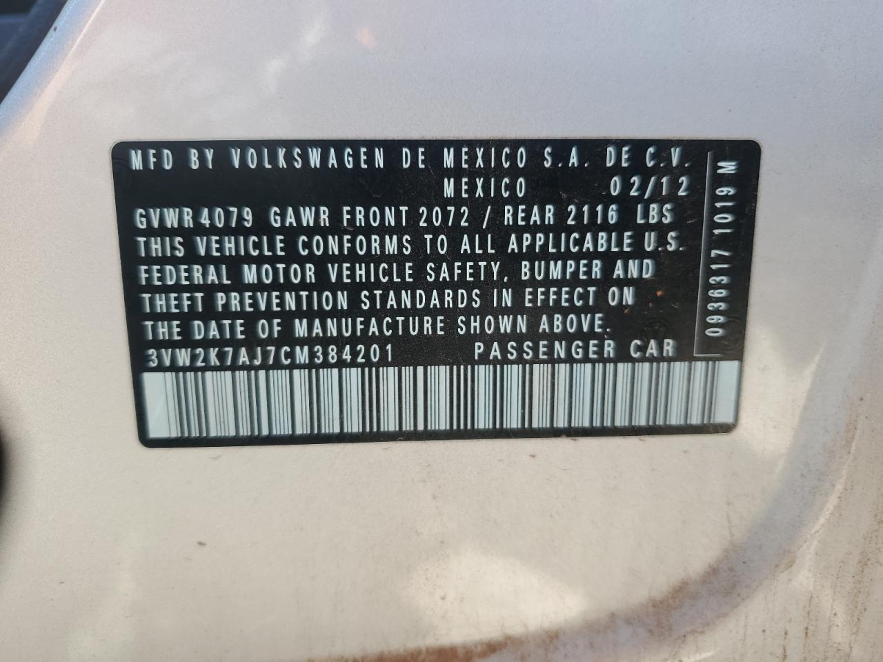 2012 VOLKSWAGEN JETTA BASE 3VW2K7AJ7CM******