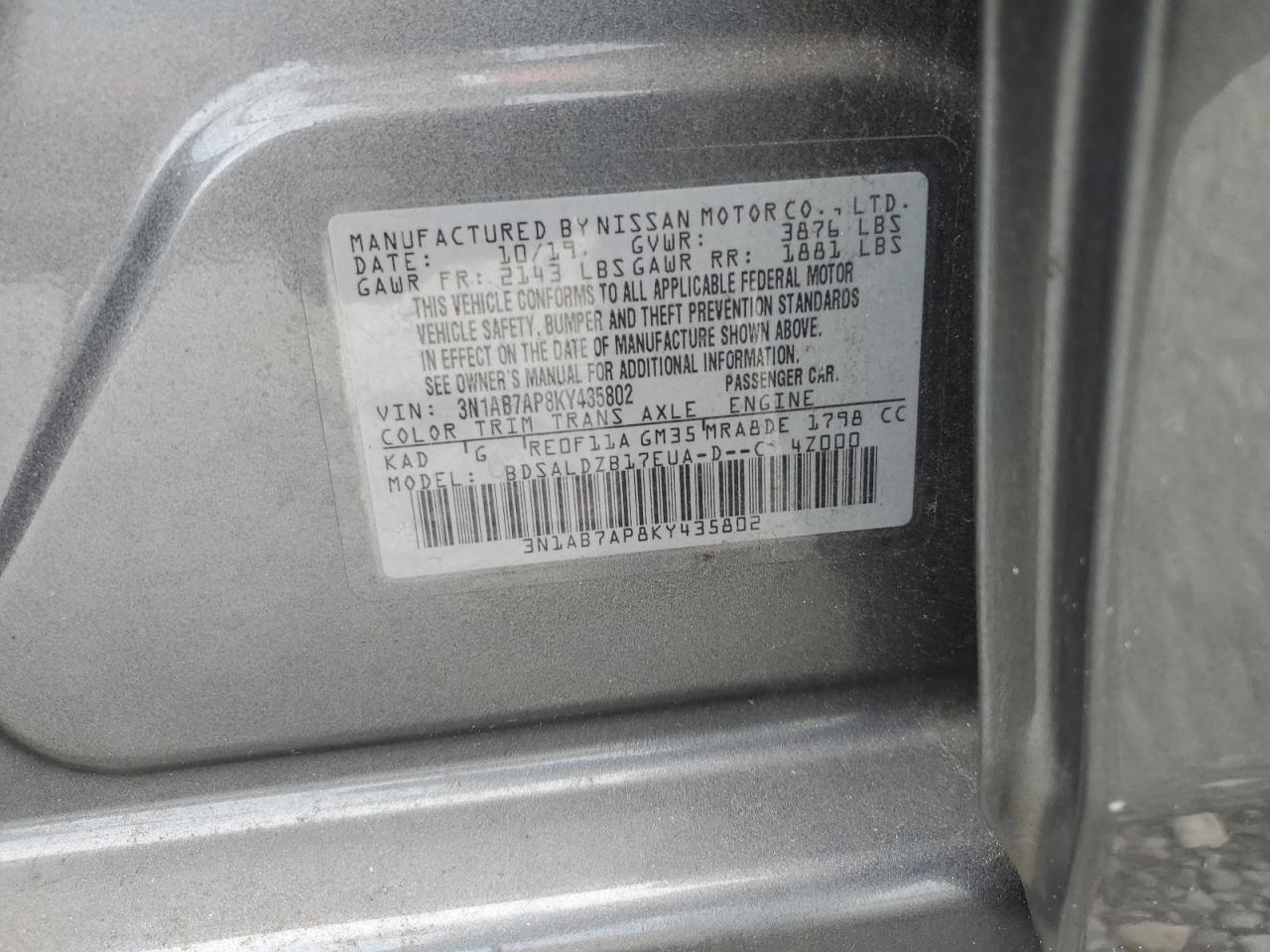 Машина оснащена 4 цилиндровым двигателем объемом 1.8 литров. Коробка передач - автомат. Тип топлива данной модели – бензин. Согласно фотоотчету с аукциона Copart пробег составляет 95 487 км. Номер кузова VIN - 3N1AB7AP8KY******.
