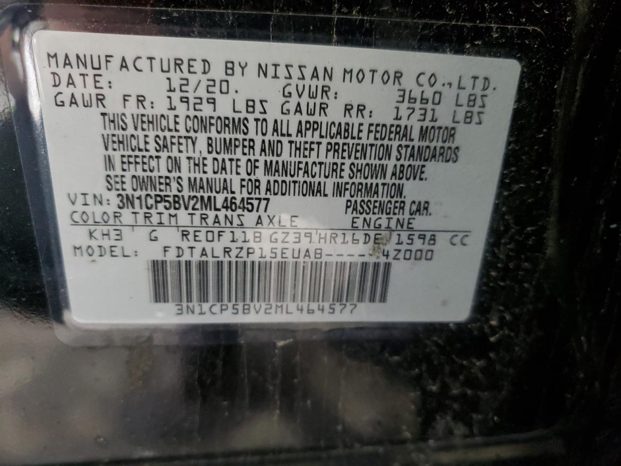 Машина оснащена 4 цилиндровым двигателем объемом 1.6 литров. Коробка передач - автомат. Тип топлива данной модели – бензин. Согласно фотоотчету с аукциона Copart пробег составляет 96 928 км. Номер кузова VIN - 3N1CP5BV2ML******.