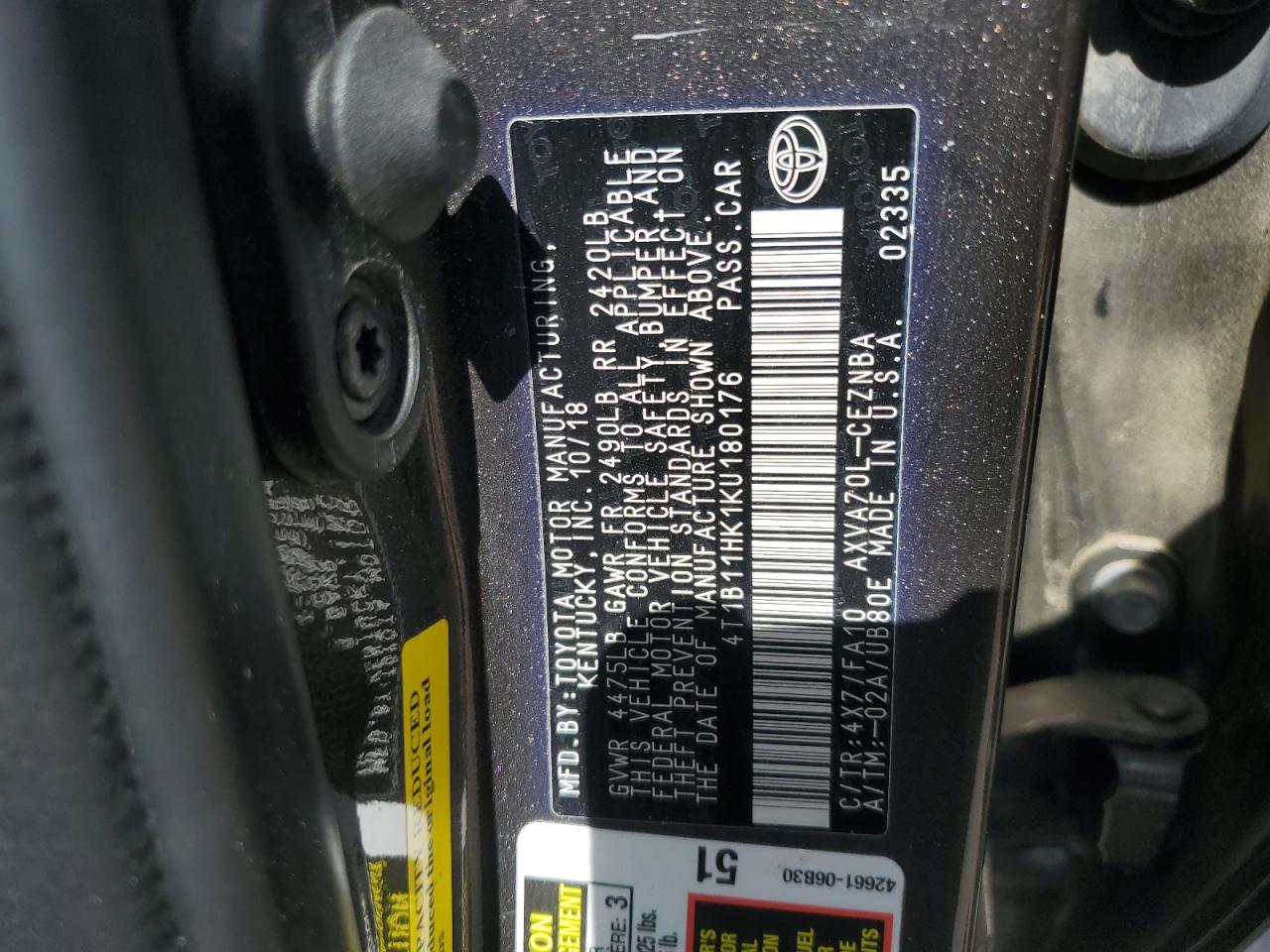 Машина оснащена 4 цилиндровым двигателем объемом 2.5 литров. Коробка передач - автомат. Тип топлива данной модели – бензин. Согласно фотоотчету с аукциона Copart пробег составляет 162 586 км. Номер кузова VIN - 4T1B11HK1KU******.