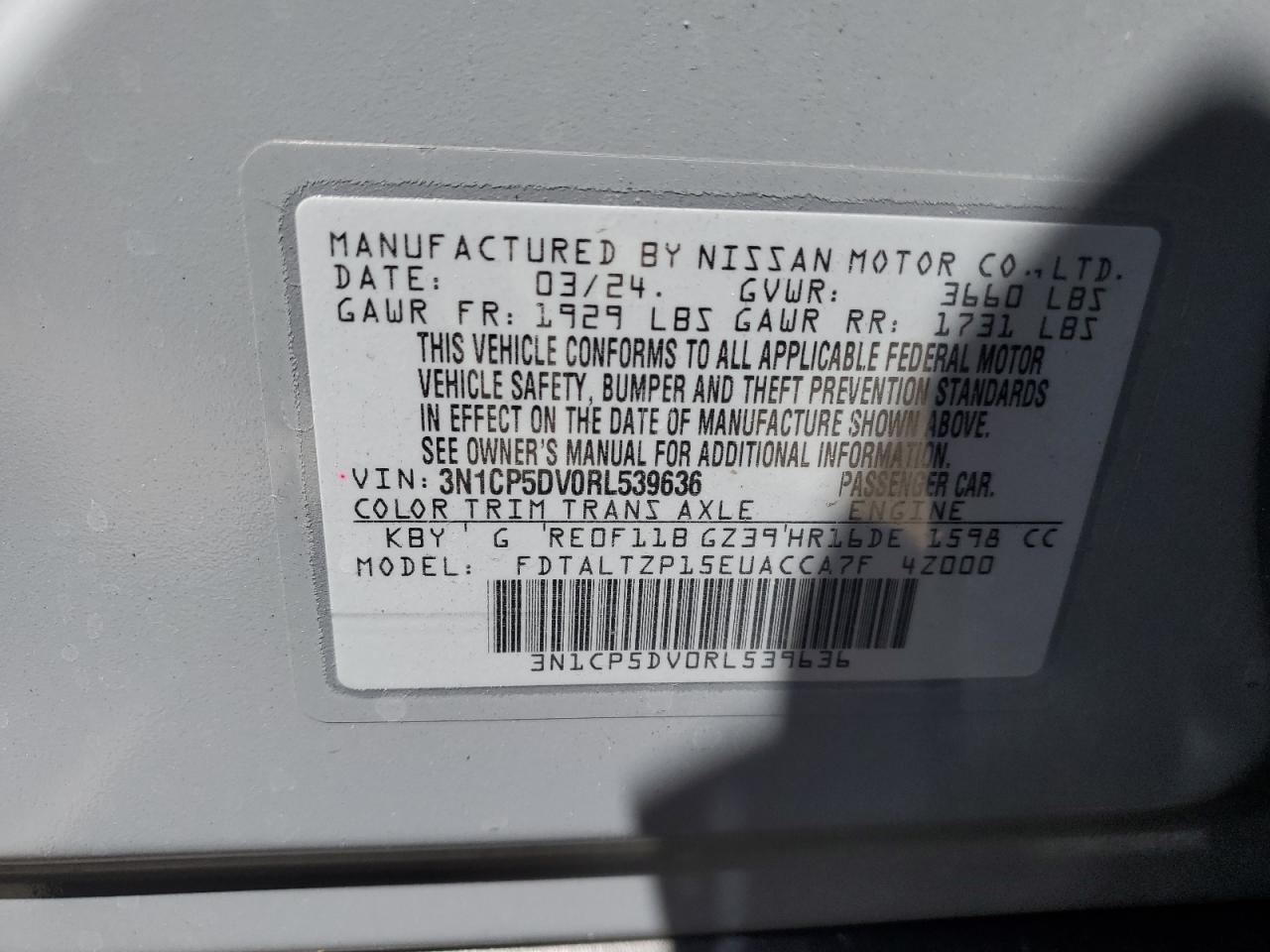 Машина оснащена 4 цилиндровым двигателем объемом 1.6 литров. Коробка передач - автомат. Тип топлива данной модели – бензин. Согласно фотоотчету с аукциона Copart пробег составляет 18 644 км. Номер кузова VIN - 3N1CP5DV0RL******.