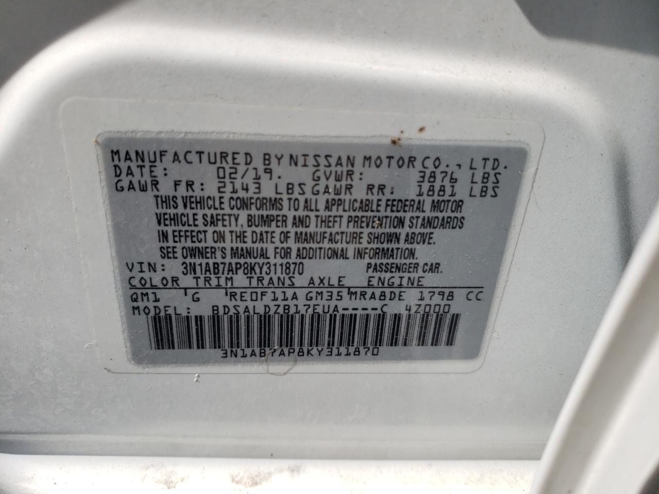 Машина оснащена 4 цилиндровым двигателем объемом 1.8 литров. Коробка передач - автомат. Тип топлива данной модели – бензин. Согласно фотоотчету с аукциона Copart пробег составляет 137 102 км. Номер кузова VIN - 3N1AB7AP8KY******.