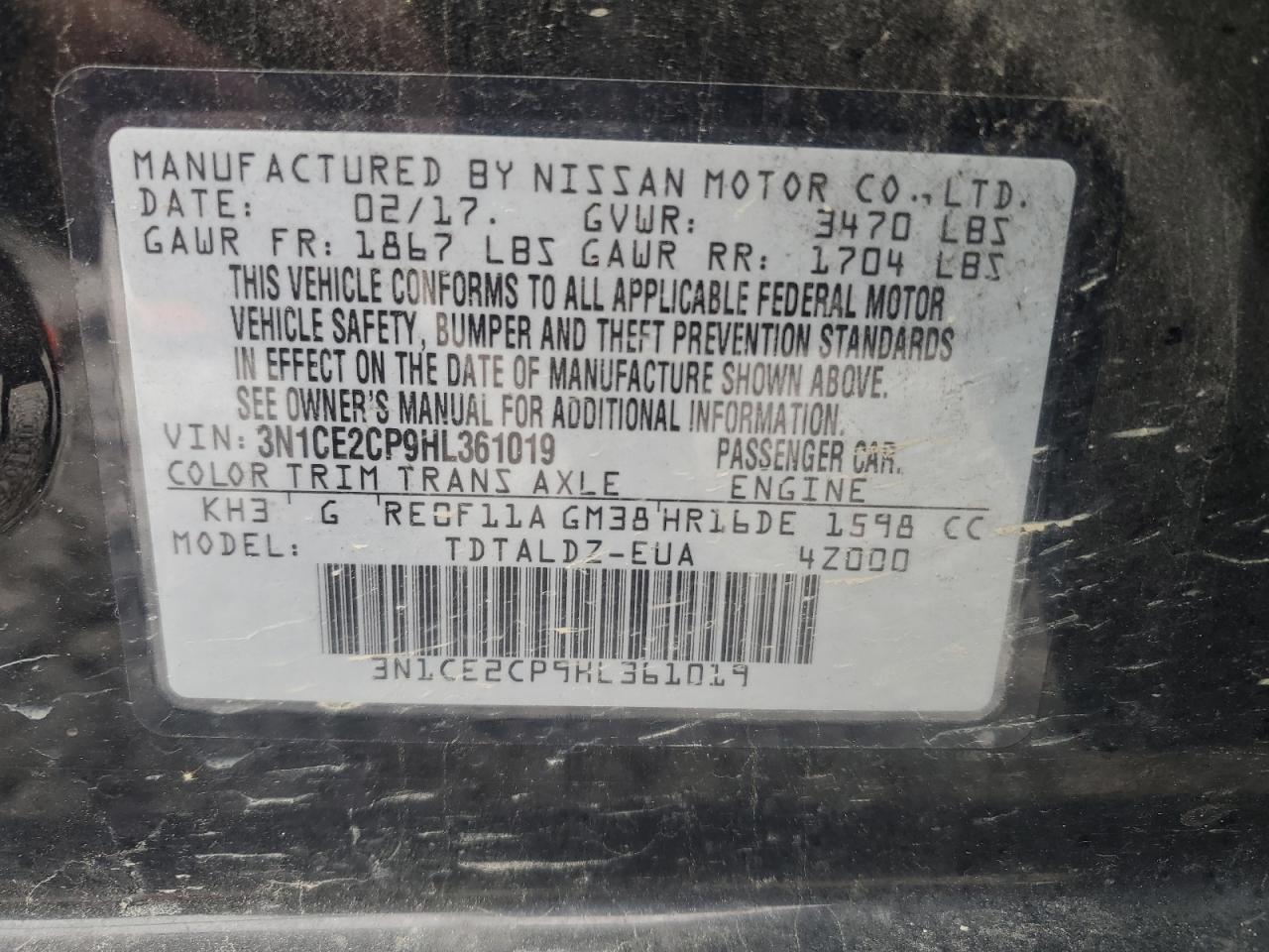 Машина оснащена 4 цилиндровым двигателем объемом 1.6 литров. Коробка передач - автомат. Тип топлива данной модели – бензин. Согласно фотоотчету с аукциона Copart пробег составляет 207 214 км. Номер кузова VIN - 3N1CE2CP9HL******.