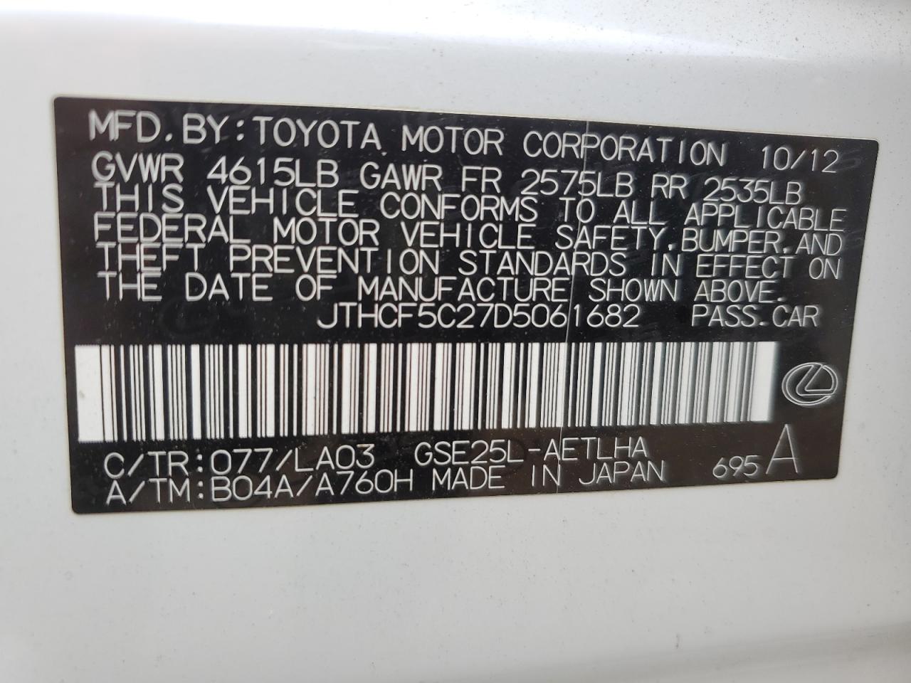 Машина оснащена 6 цилиндровым двигателем объемом 2.5 литров. Коробка передач - автомат. Тип топлива данной модели – бензин. Согласно фотоотчету с аукциона Copart пробег составляет 239 705 км. Номер кузова VIN - JTHCF5C27D5******.