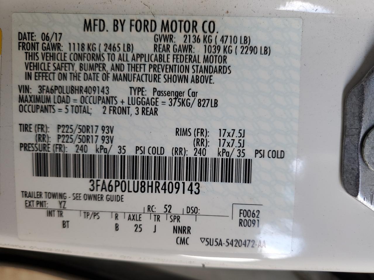 Машина оснащена 4 цилиндровым двигателем объемом 2.0 литров. Коробка передач - автомат. Тип топлива данной модели – гибрид. Согласно фотоотчету с аукциона Copart пробег составляет 204 123 км. Номер кузова VIN - 3FA6P0LU8HR******.
